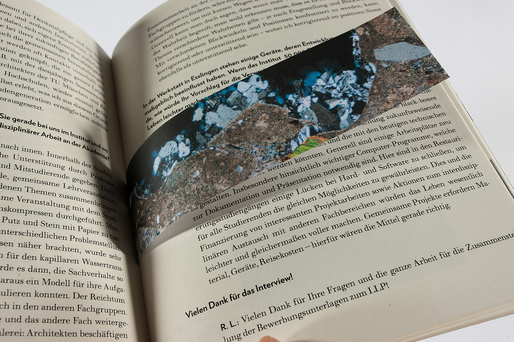 Die Mikroskop Aufnahmen und Fotos sind auf transparentes Papier gedruckt und befinden sich eingenäht, zwischen den Seiten.