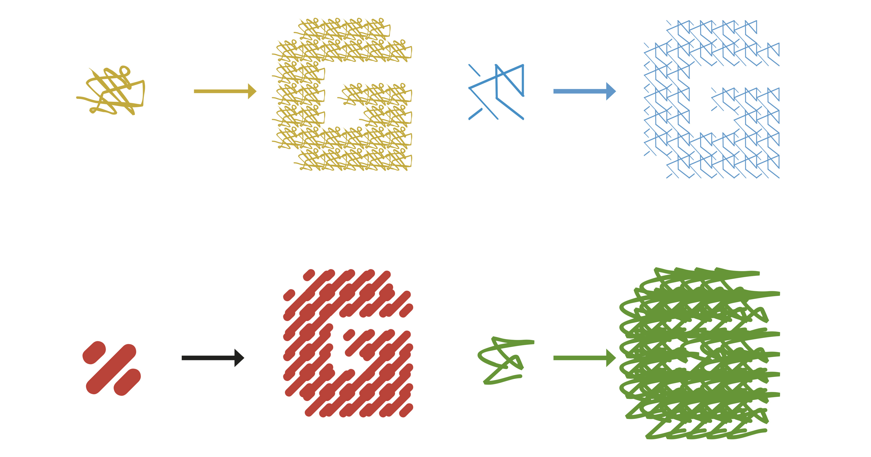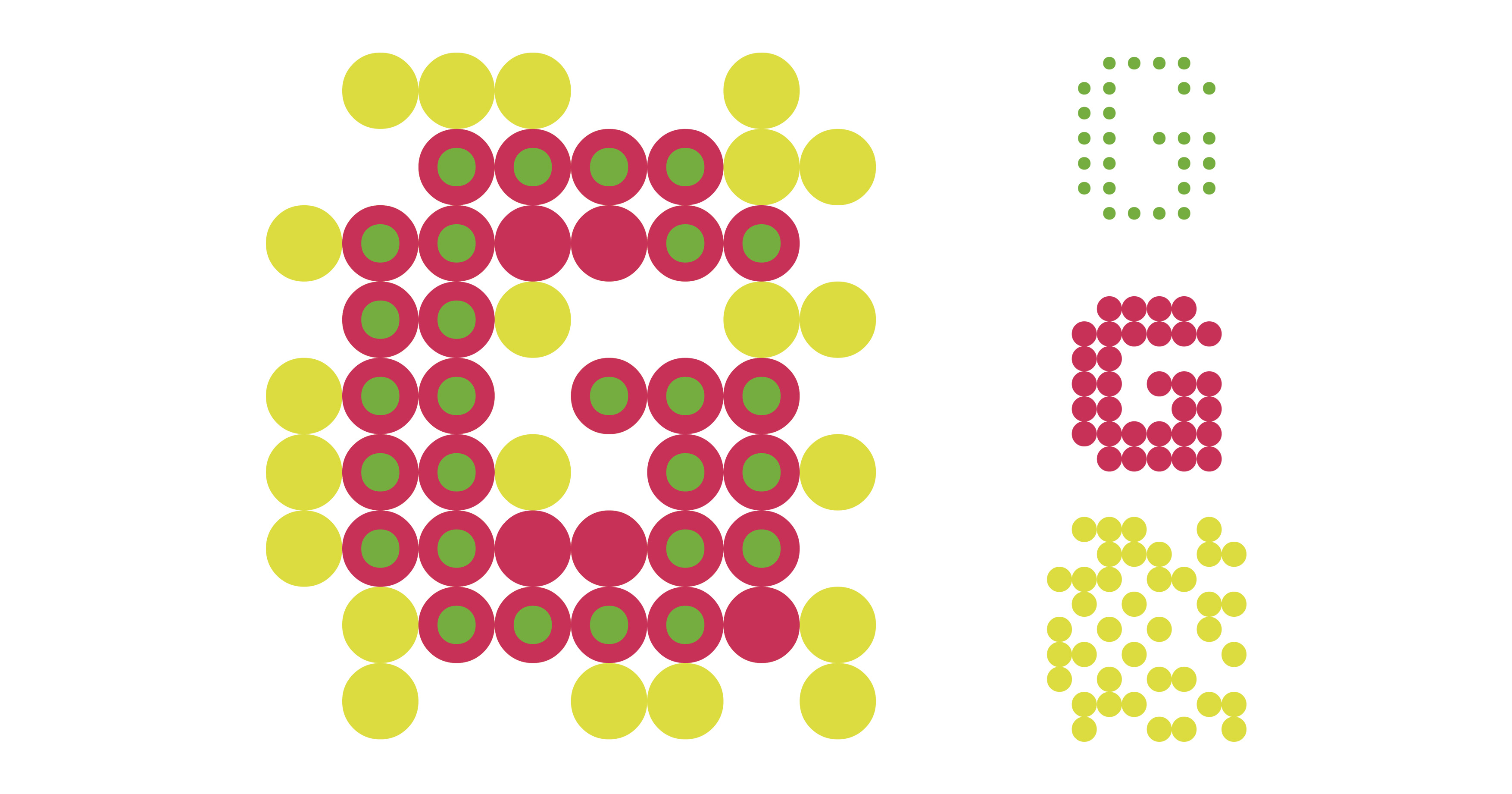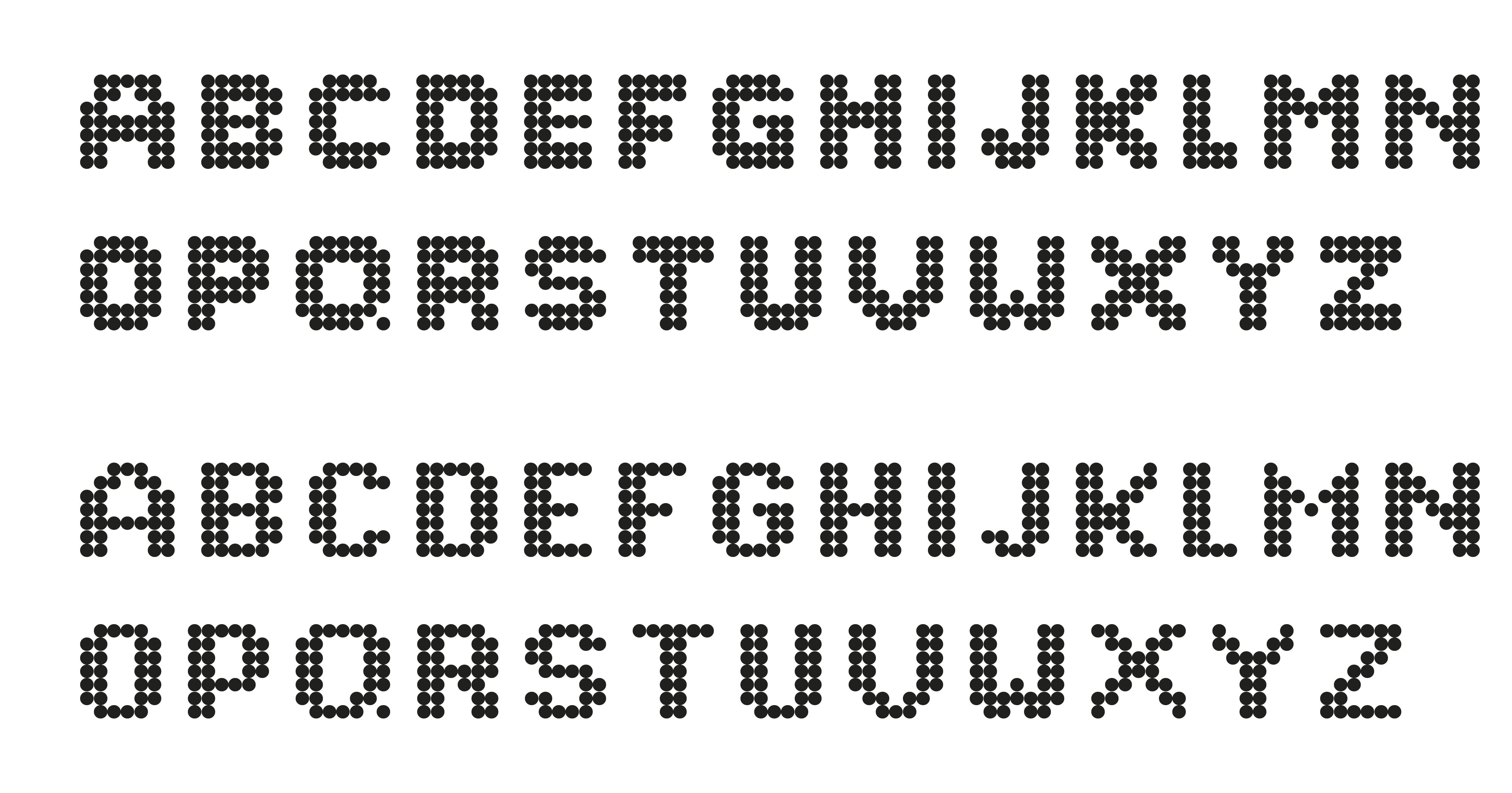 Zwei der Schnitte lassen sich als reguläre Pixel-Schrift in Regular und Bold verwenden, der dritte Grundschnitt orientiert sich abstrakt an den Formen der Buchstaben. Da alle Schnitten auf dem selben Raster aufgebaut sind, sind sie untereinander kompatibel und können kombiniert und überlagert werden.